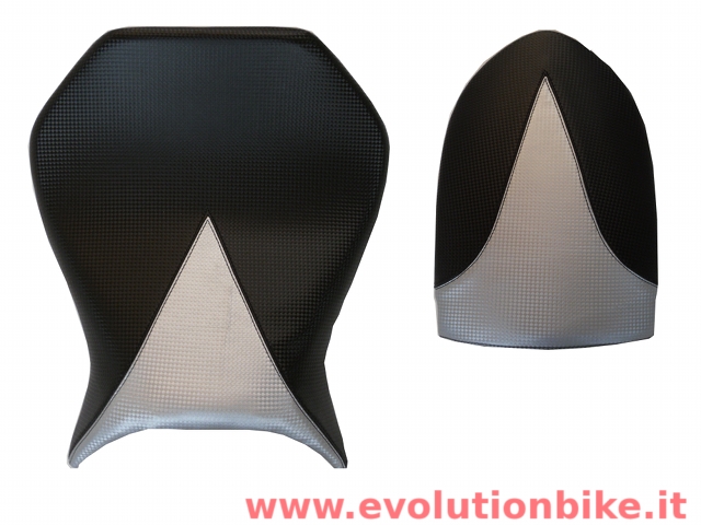 Carbon Look seats. Visually pleasing, anti-slip, available in different colours. Looks like a carbon fiber. Made in Italy. Seat and pillion.
