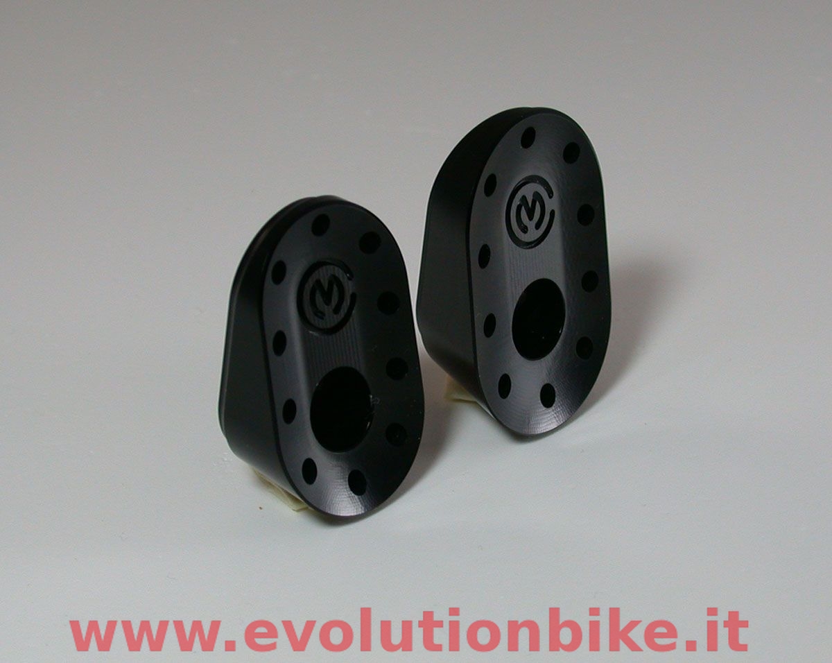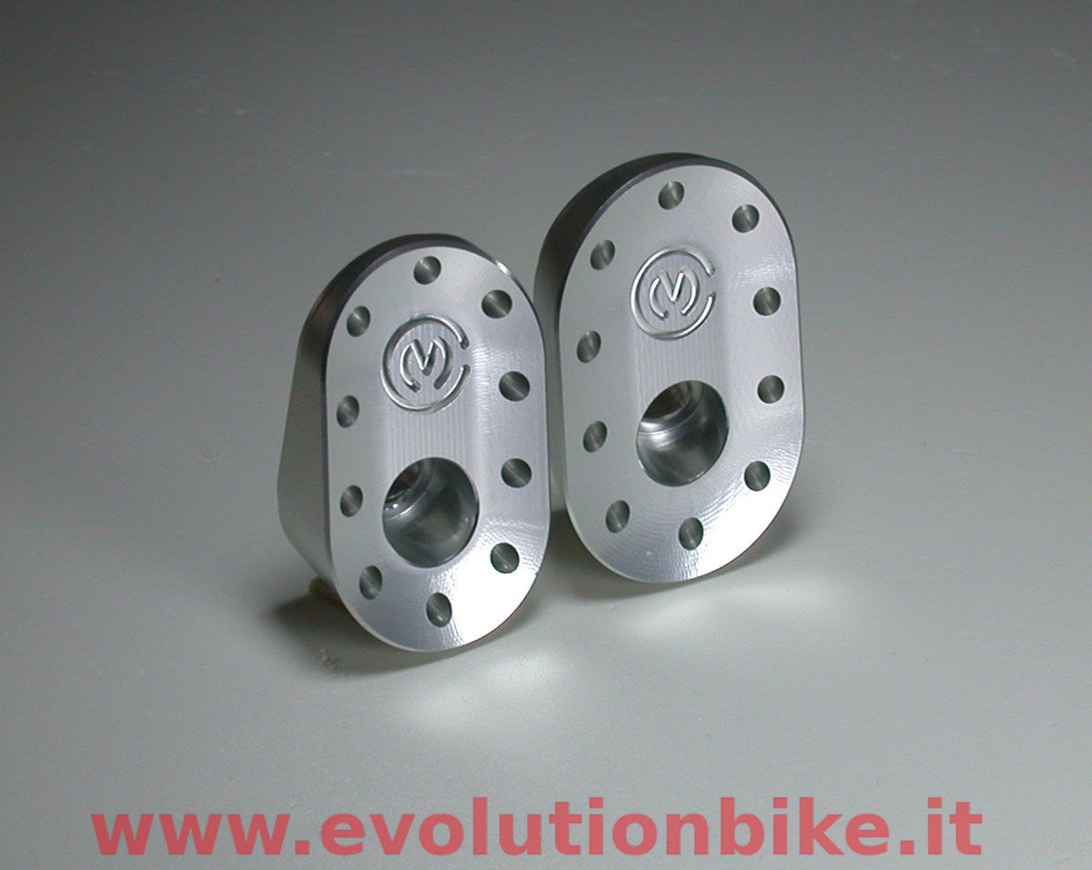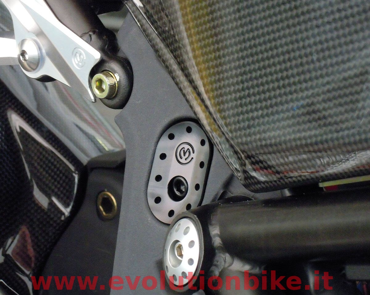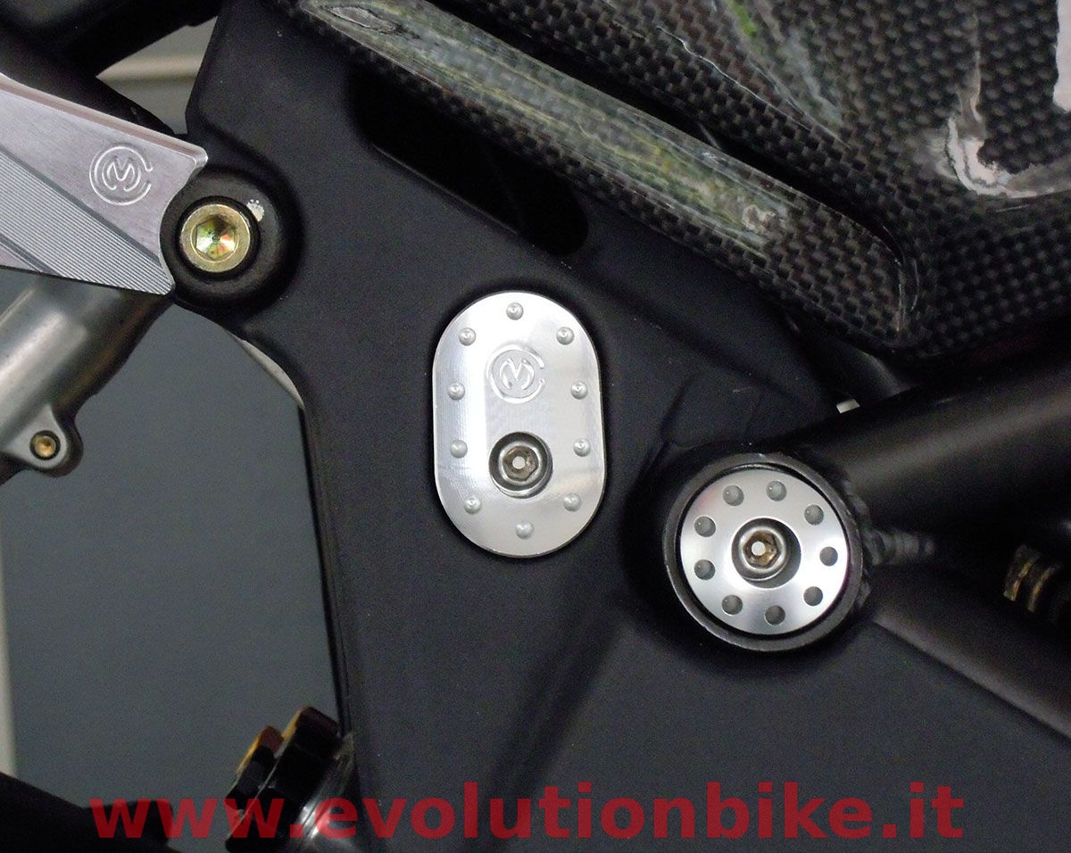 Motocorse upper frame plates plugs are made of Alluminium (Anticorodal EN AW 6082) and constructed through the use of CNC machines. The kit is composed of 2 plugs that are fixed to the frame plates through a special pin. It is supplied with everything you need for installation and it's easy to install. The finish is obtained by anodic oxidation, available in different colors : Red, Silver and Black.