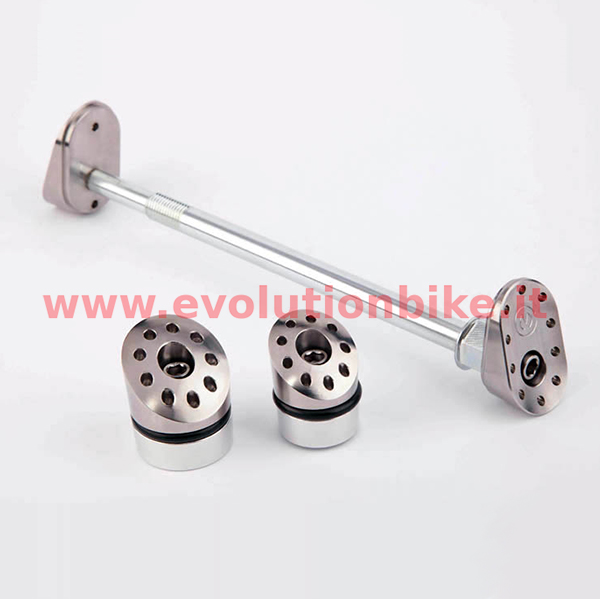Motocorse frame plates plugs are made of Titanium and produced through the use of CNC machines. The kit is composed of 4 plugs that are fixed to the frame plates through expansion by means of conical bush, metallic o-ring and stainless steel screw. For each hole of the frame plates there is a dedicated plug with specific diameter and the right inclination.