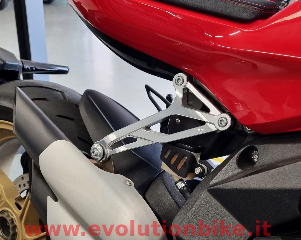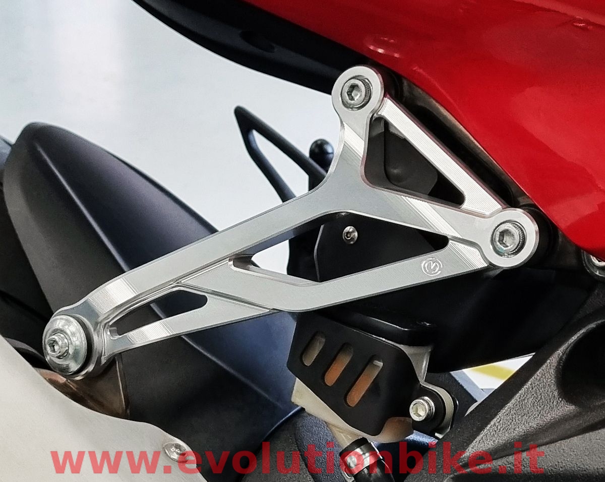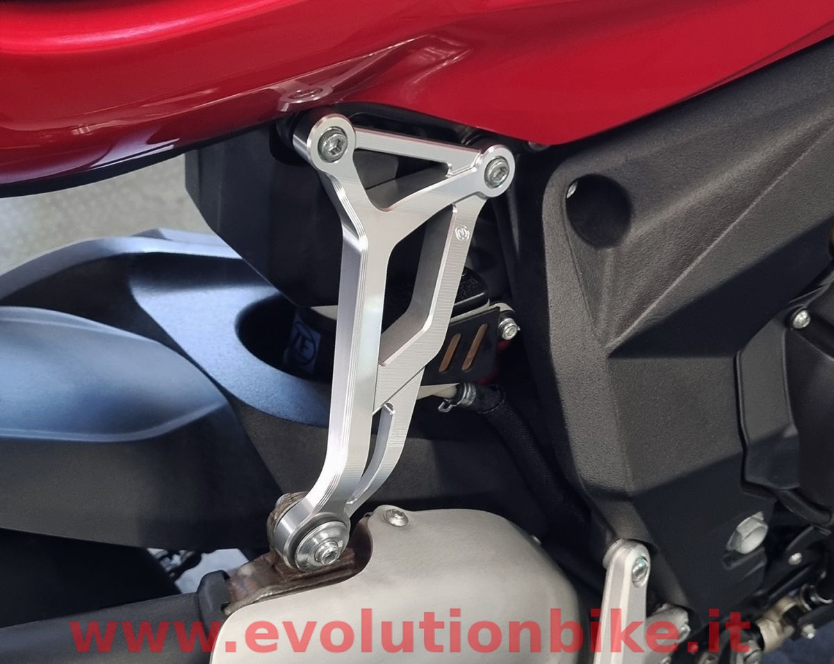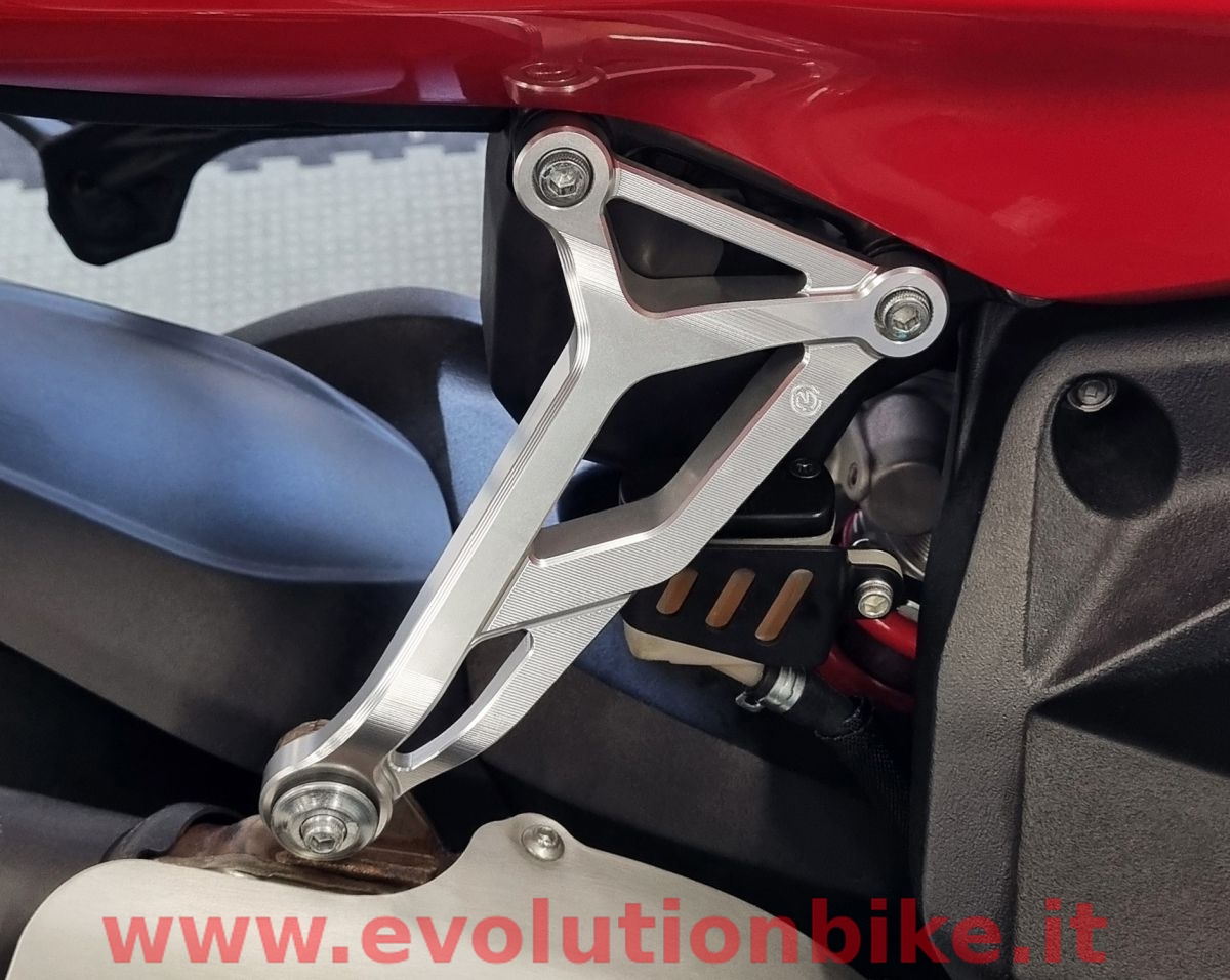 The Motocorse silencer support allows to remove the right passenger footpeg support from the MV Agusta F3 and Superveloce Euro4/Euro5 and offers very a high-end race-style look.