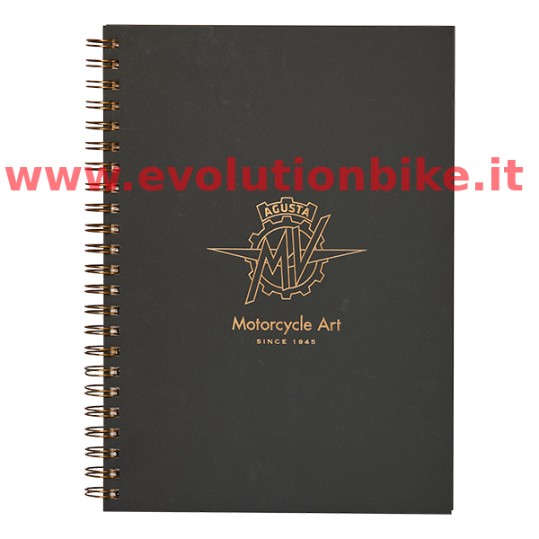 Elegant MV Agusta block notes notebook in black with opaque gold foil edges. Featuring a 1.5 mm cardboard cover with a bossed MV Agusta logo in a gold finishing. Historic MV Agusta photos printed on front and back internal pages. The MV Agusta block note stays secured with a bronze metal spiral. Contains 96 sheets. Each sheet weighs 90 grams.