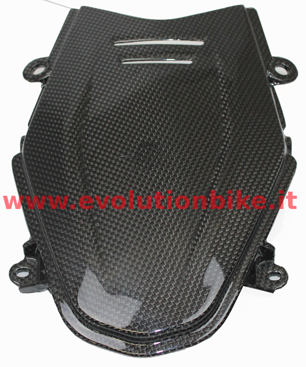 Upper underseat in carbon fiber. Produced in autoclave, a process that applies different thermal cycles so that temperature and pressure are distributed evenly, ensuring the production. Personalized with MV Agusta logo.