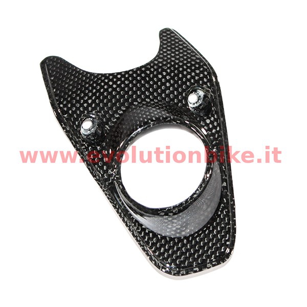 Ignition lock cover as OEM in carbon fiber. Manufactured using autoclave process. It's necessary to remove the gasket from the OEM key guard to apply it, with glue, on the carbon part. Not fittable on models with steering damper.