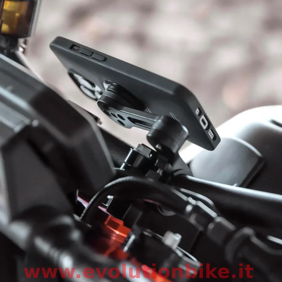 Machined from aircraft aluminum Mobile phone can be fixed in vertical or horizontal position through ad adhesive plate Super-stable 360° adjustment in 6° steps Personalized with MV Agusta logo