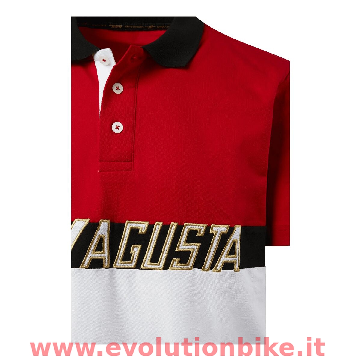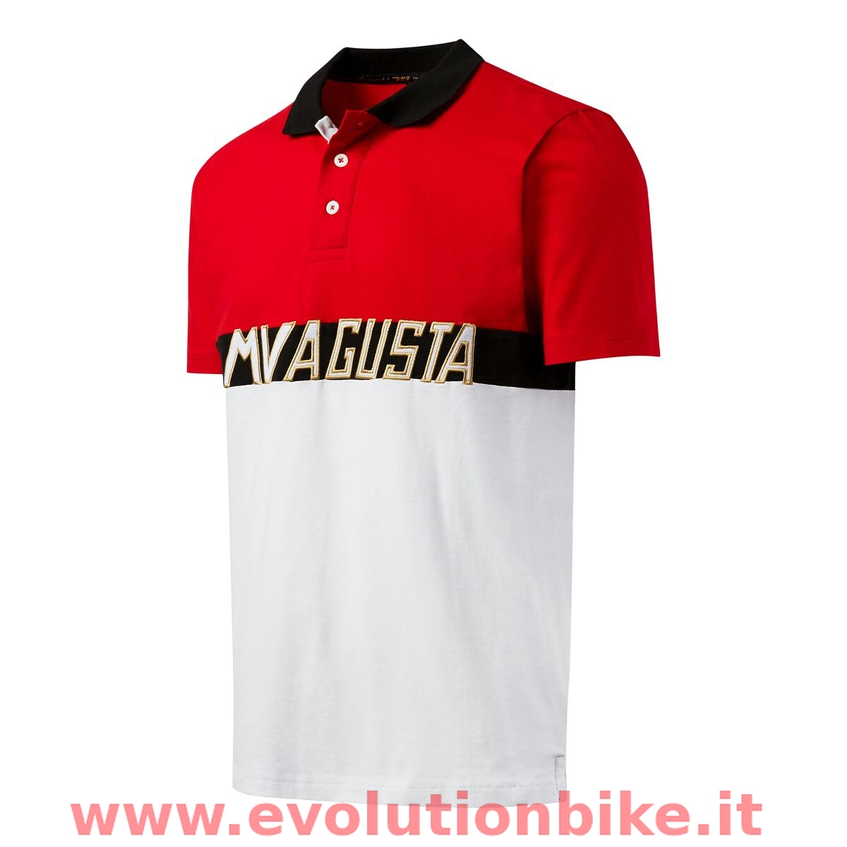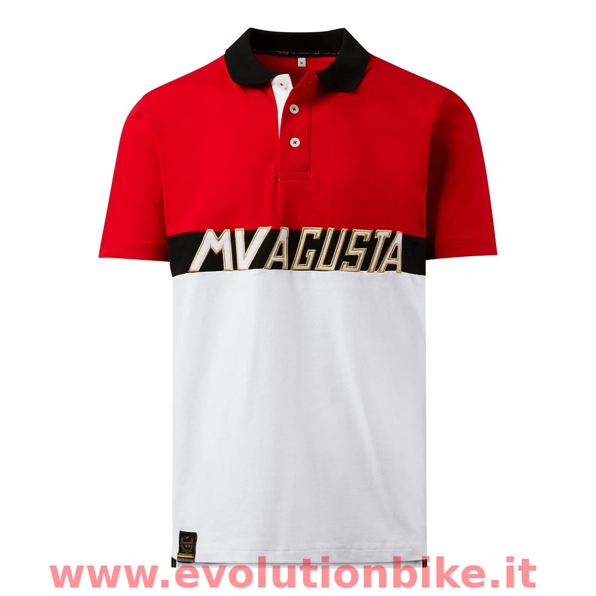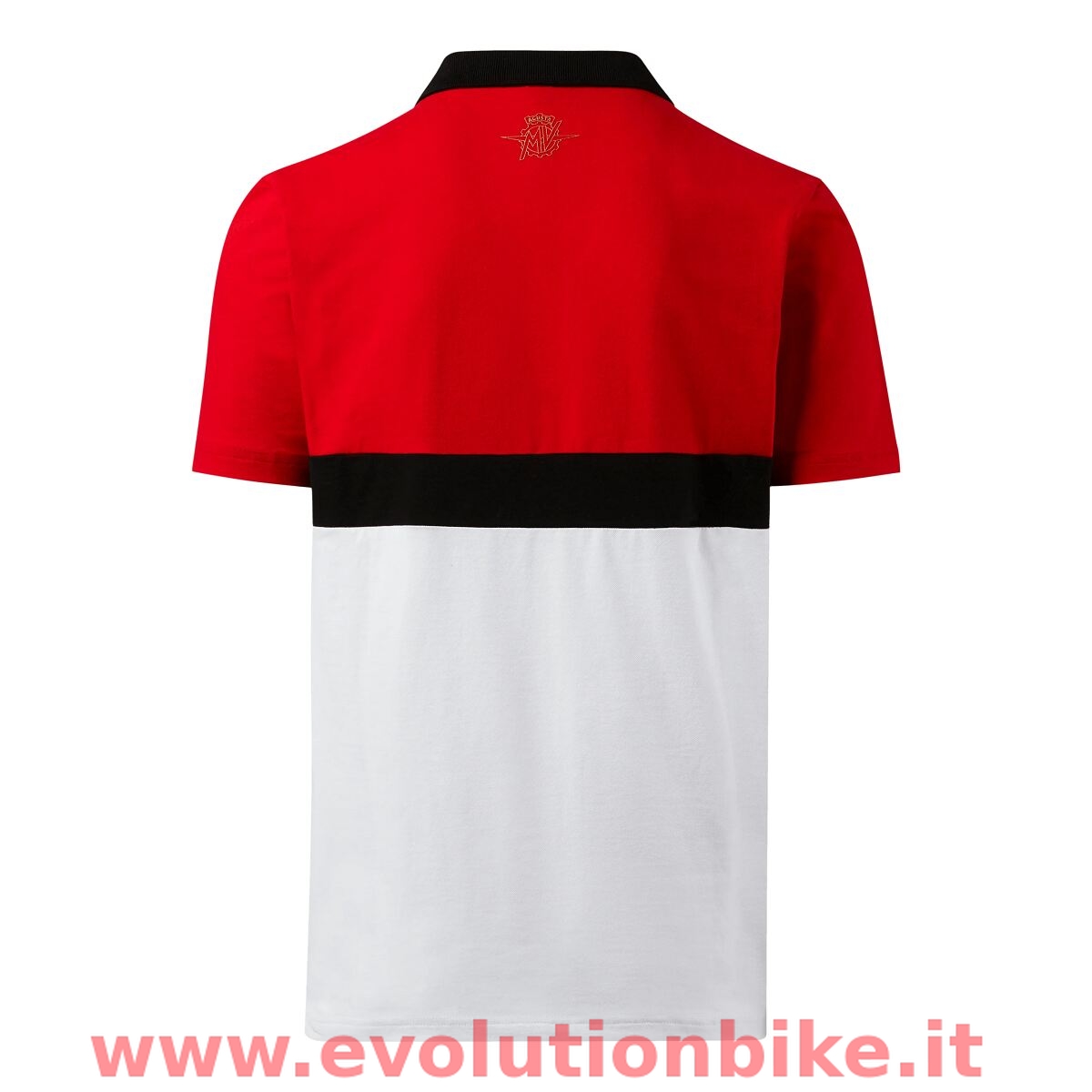 Legends are forever. Combining MV Agusta's DNA known for style and elegance, the MV Agusta Heritage polo comes in a contrasting red, black, and white colourway. Features MV Agusta logo on the front and a gold outlined MV logo on the back.