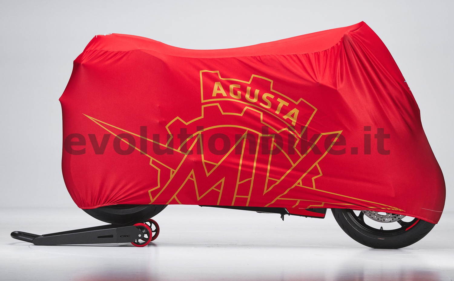 Indoor red cover. Personalized with gold MV Agusta logo. Made in stretch material. It covers the motorcycle, protecting it from dust and dirt. 100% Made in Italy.