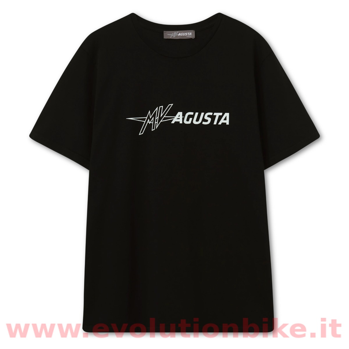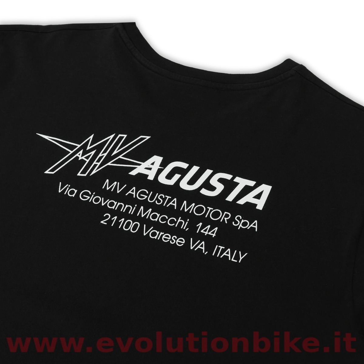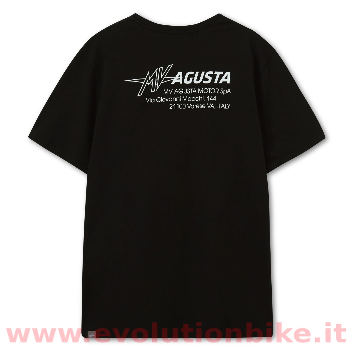 Ribbed crew neck. Printed MV Agusta small logo on the chest. Printed extended logo on the back with MV Agusta Schiranna address. Short sleeves. Straight hem. Regular fit.