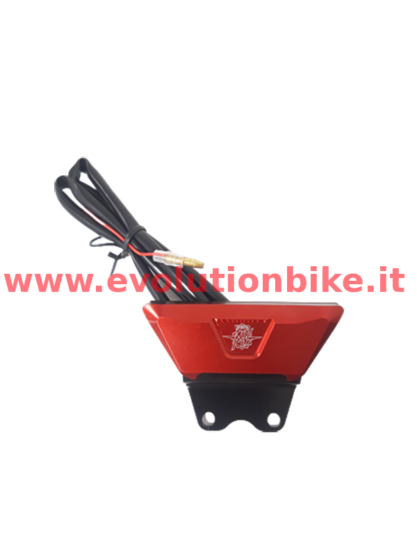 Red led licence plate light with aluminium shell machined from billet. 3 led device 12V. Indicative dimensions: Width 80-50 mm height 29 mm. Already supplied with dedicated mounting plate. Compatible with the following number: SPPTT001RD and 8000C9392.