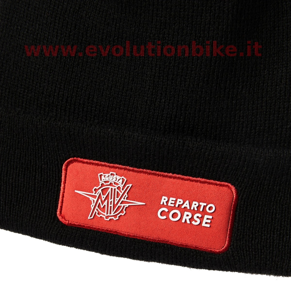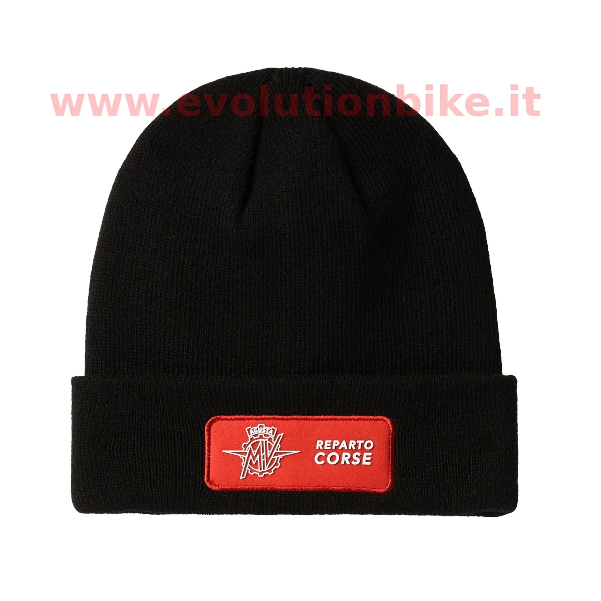 MV Agusta Reparto Corse beanie. Made of 30% wool and 70% acrylic with a microfiber patch and rubberized logo.