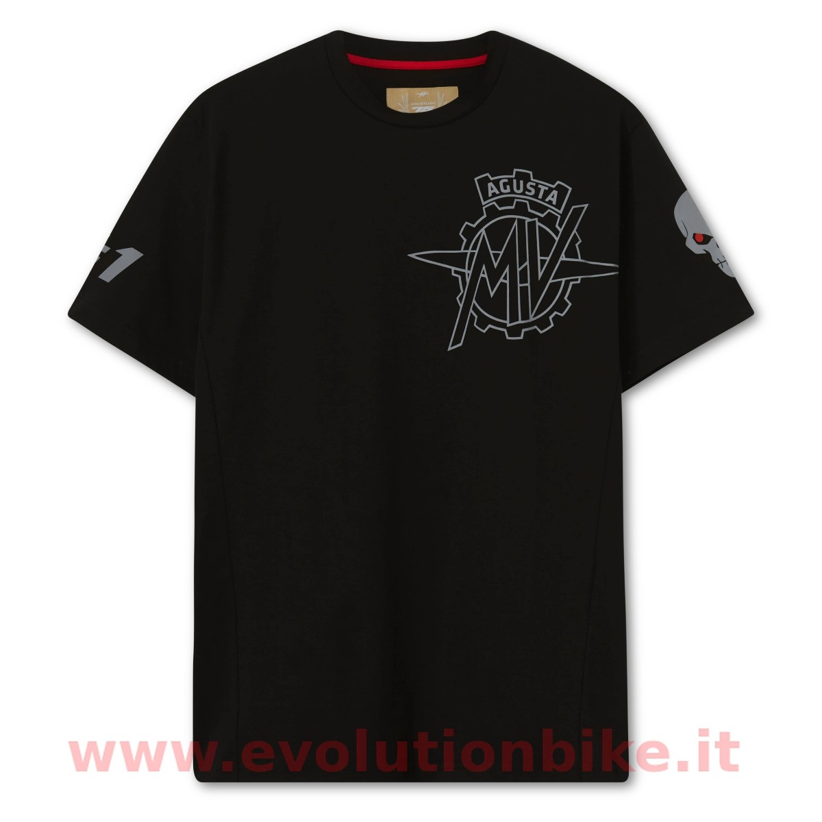 Inspired by the intimidating aesthetic of the MV Agusta RVS #1, the specially designed RVS T-Shirt is nonetheless. The aggressive black colourway T-Shirt features an oversized outlined MV Agusta logo on the front chest and the RVS logo on the back. For an additional touch of flare, the sleeves .are decorated with the red-eyed skull and #1