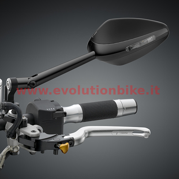 Integrated Light: a good solution to replace the mirror on sports bikes, and a racing touch as an alternative on a naked. Large reflective surface, to comply with European standardsand convex glass: two precious features that ensure optimum visibility in all conditions. The aerodynamic shape helps to prevent turbulence at speed. Available colours: Silver, Black. The mirrors include the adaptors kit for the fitting.