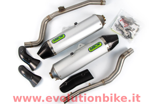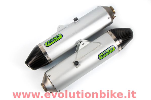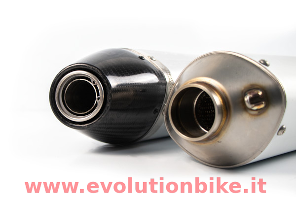 Aluminiun silencers with carbon end cap. Wonderful exhaust to increase min. 5% of power. Weight: less 60% than original one. Racing not homologated.